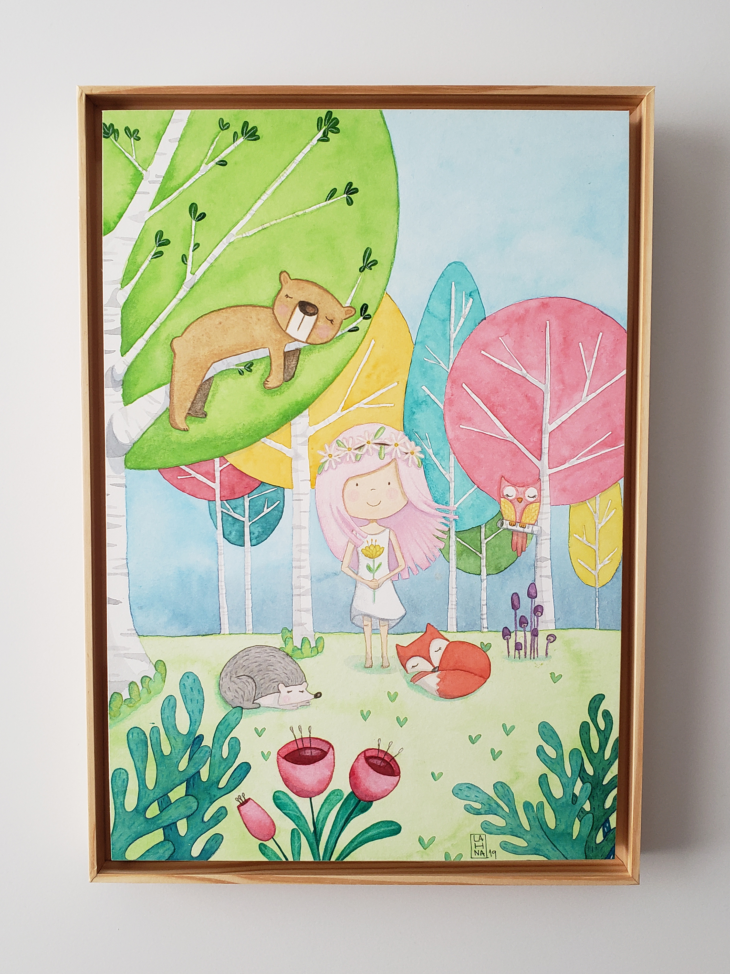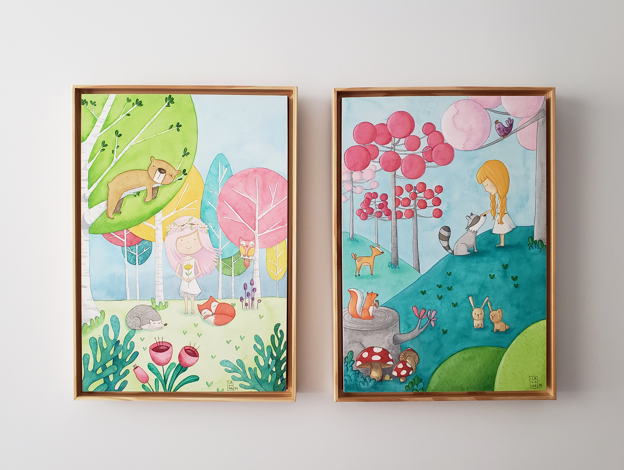 These two watercolors decorate the wall of a very bright and colorful bedroom. The room’s owner, a happy girl named Malu, loves candy colors and woodland animals.
